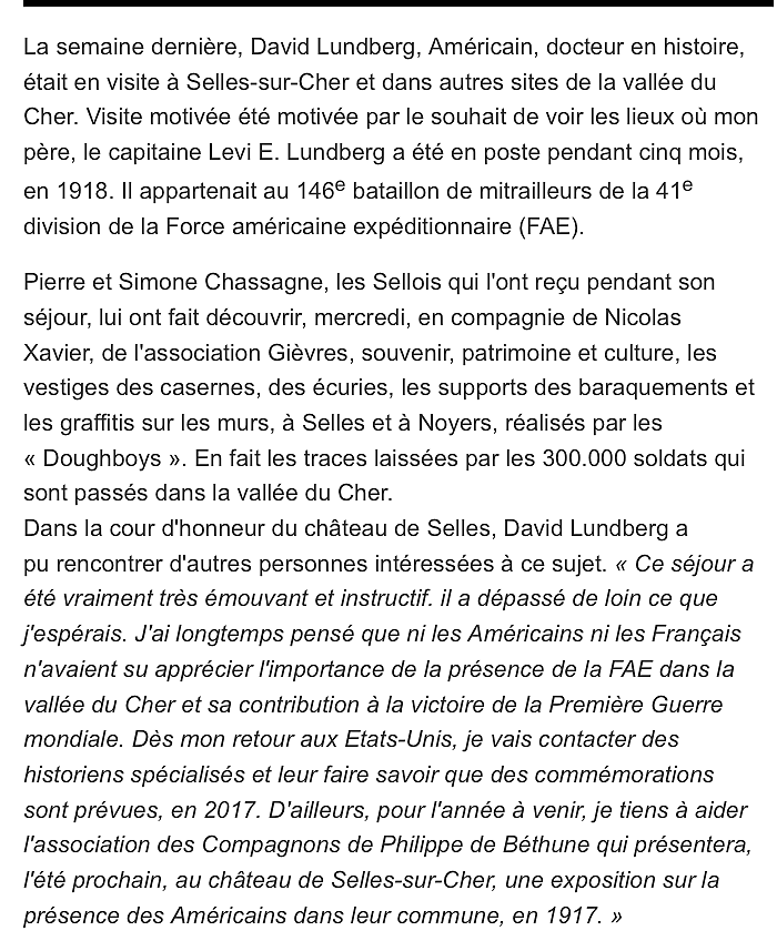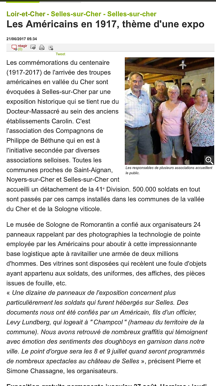 « derniers jours » pour l’exposition-Selles sur cher » 100 ans plus tard – « LE SOUVENIR DES SOLDATS AMERICAINS » à Selles sur cher jusqu’au 27 Août 2017