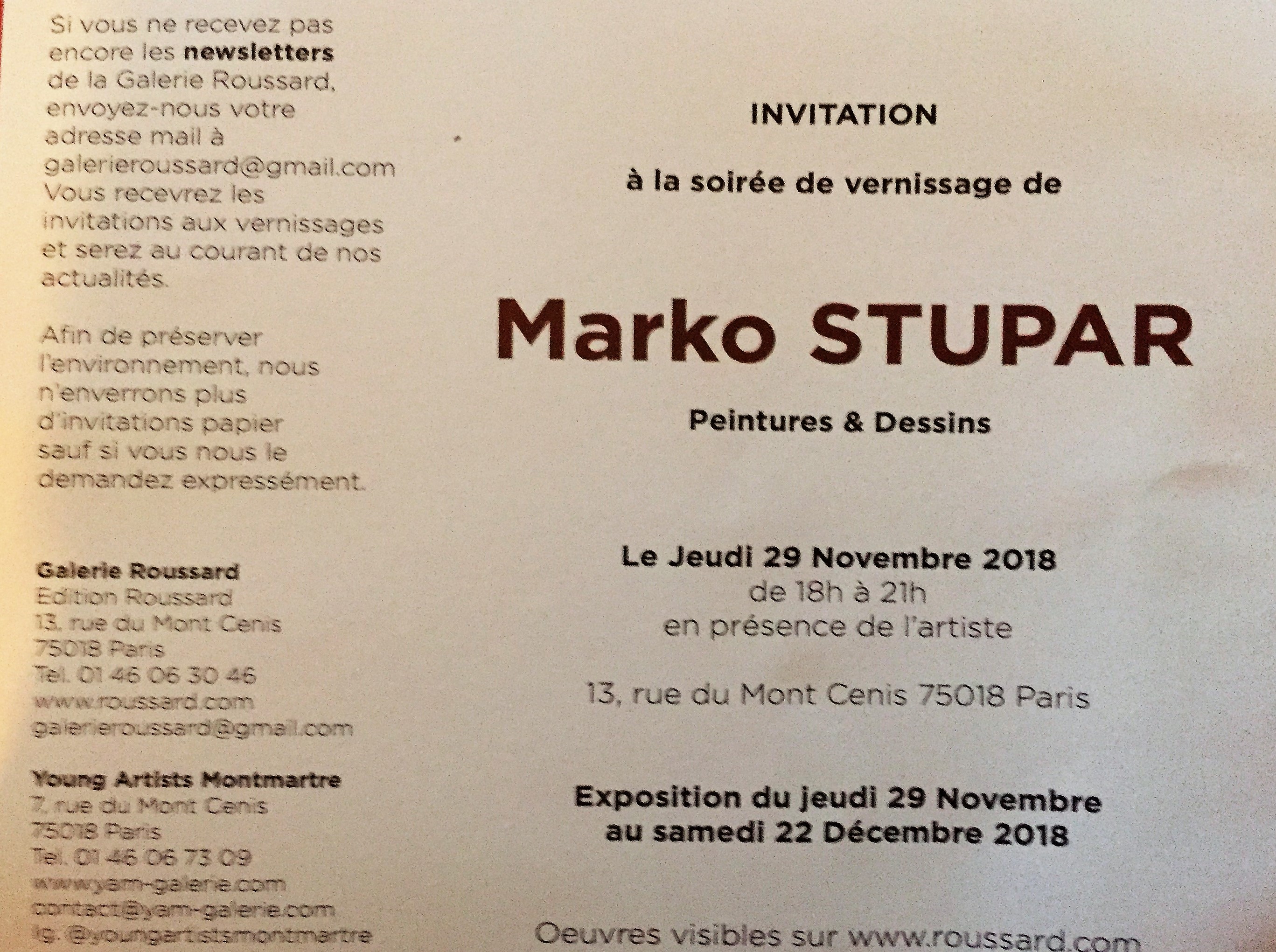 Galerie Roussard exposition Marko Stupar (peintures et dessins) 29 Novembre au 22 Décembre 2018