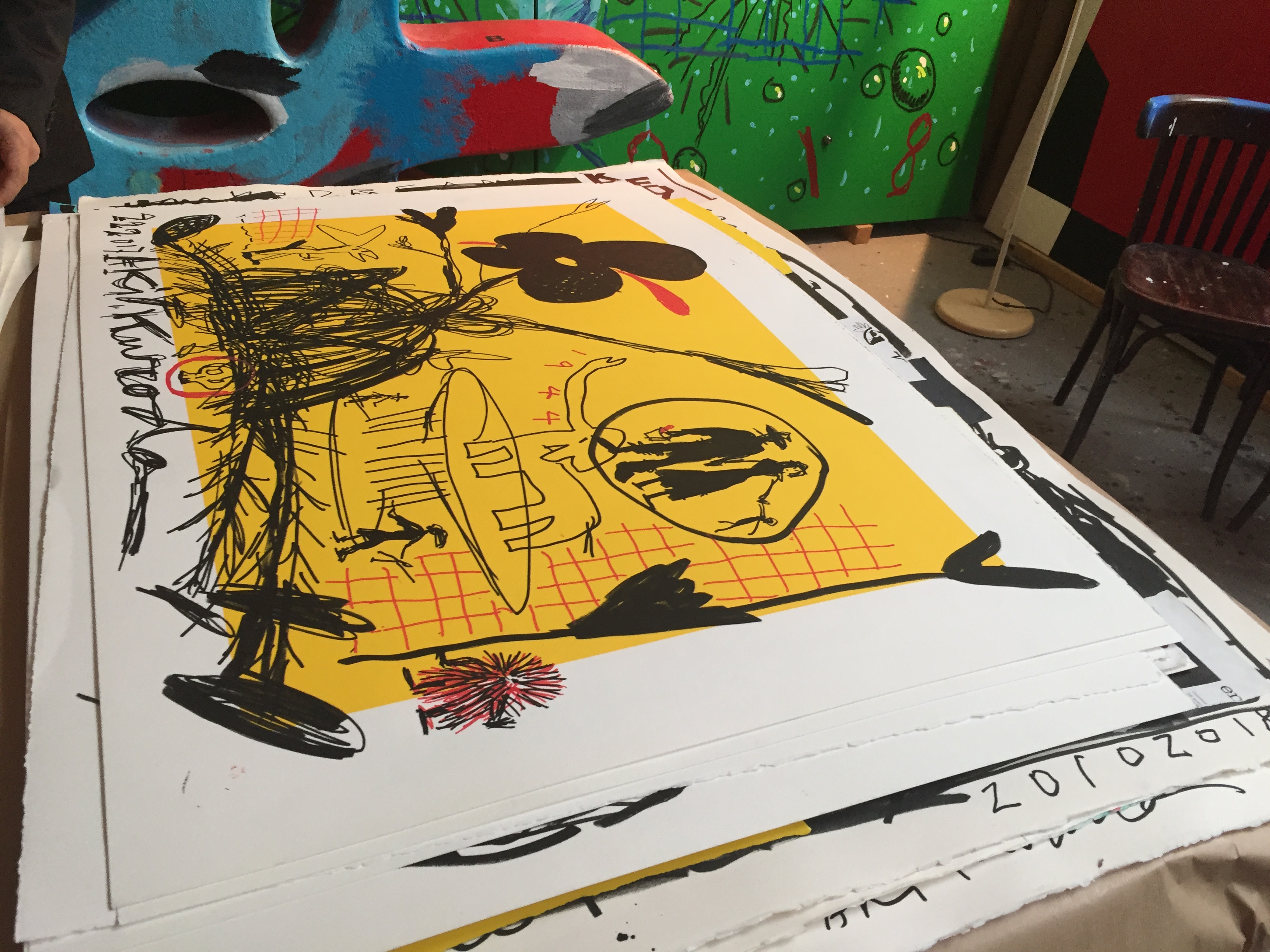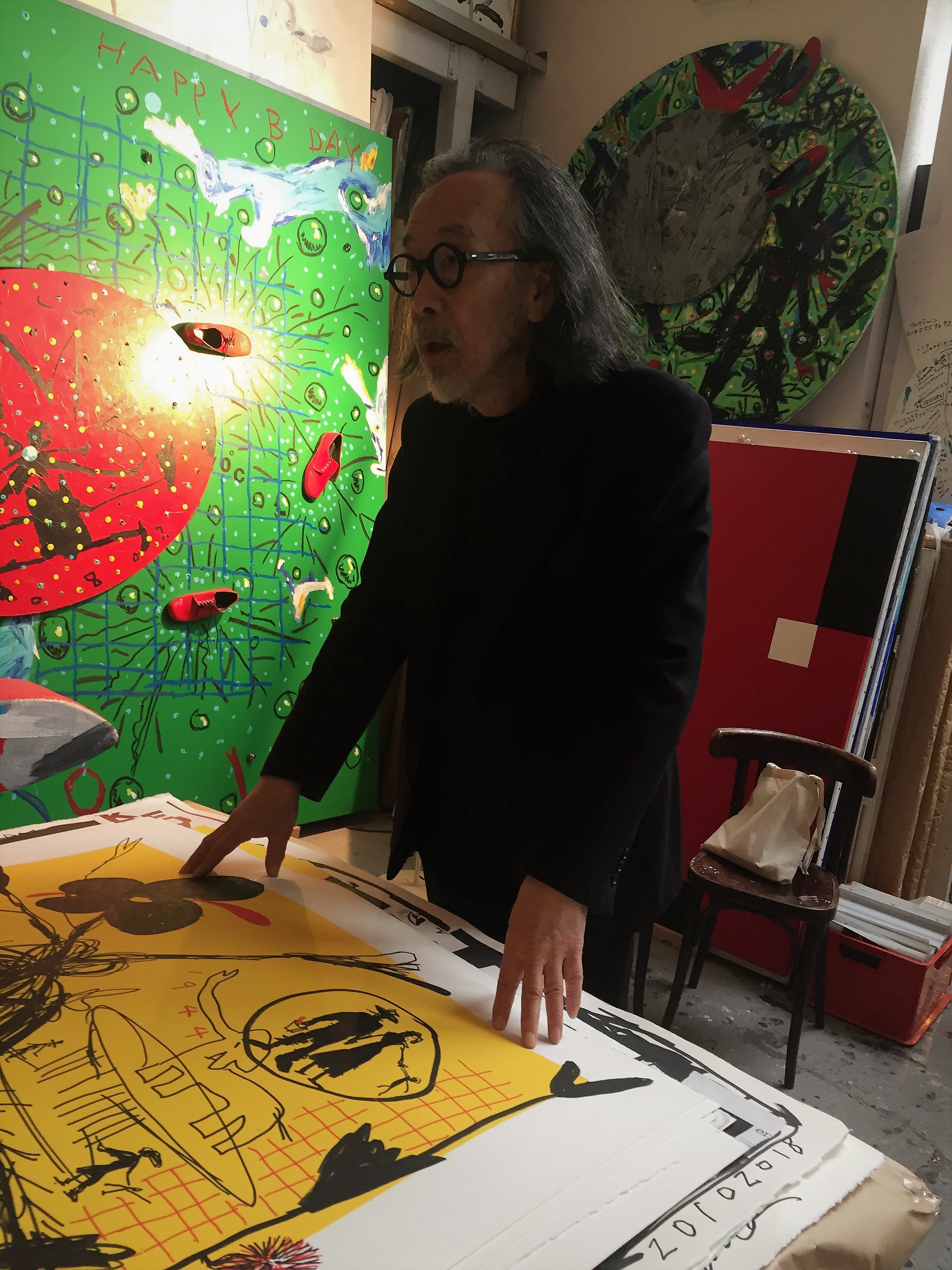 Des œuvres sur papier de 2017 , de retour de Belgique- et bien sur les découvertes de travaux divers et de grands formats- un accueil sympathique et chaleureux- les commentaires et échanges entre Yoyo Maeght et Aki Kuroda passionnants.