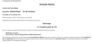 Centre d’art Yvon Morin-Le Poet-Laval (Drôme) exposition Mireille Moser-Iris de Chanterac 16 Juillet au 1er Septembre 2019
