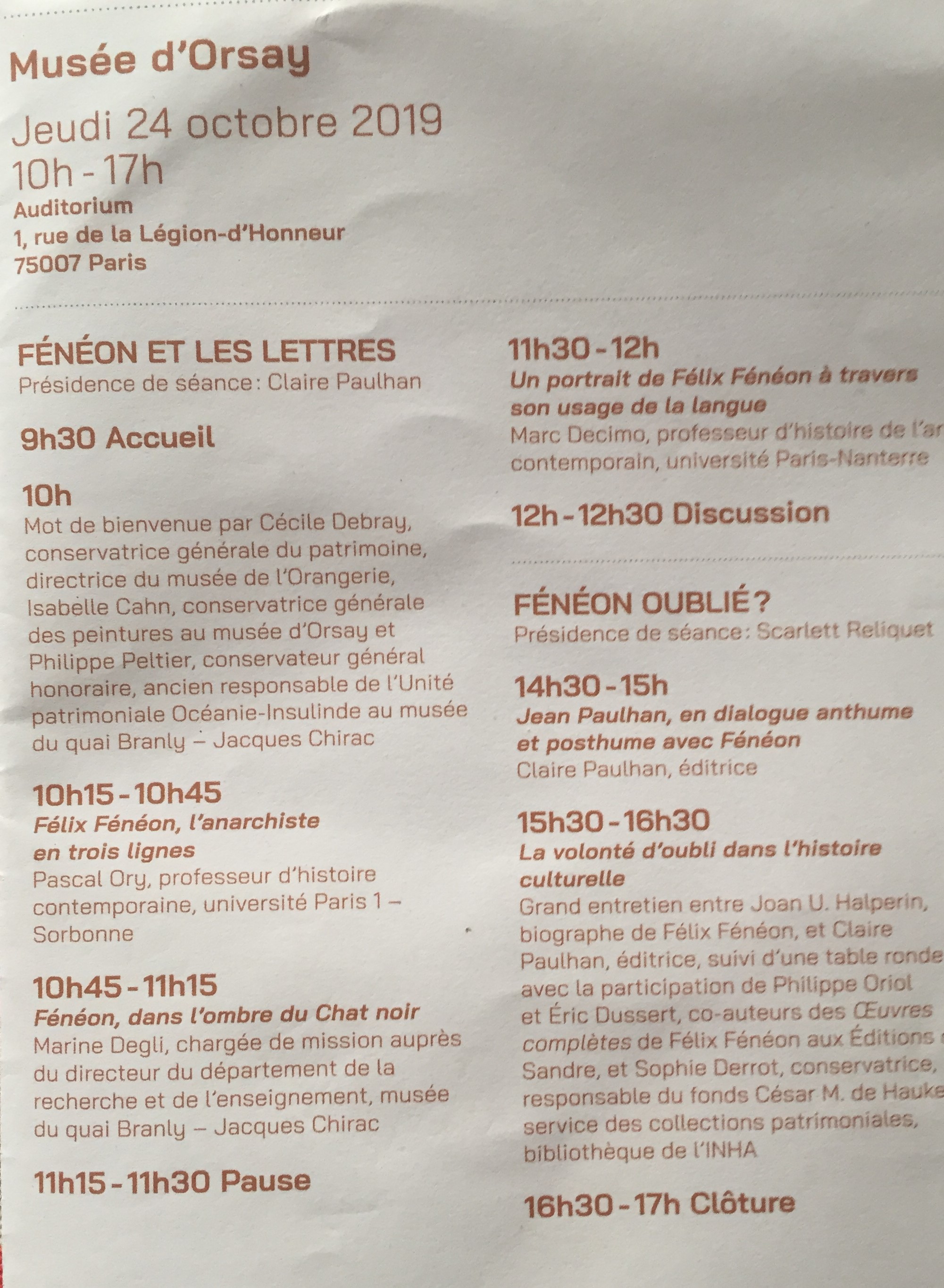 Ce jour colloque 2me partie sur Fénéon au Musée d’Orsay.