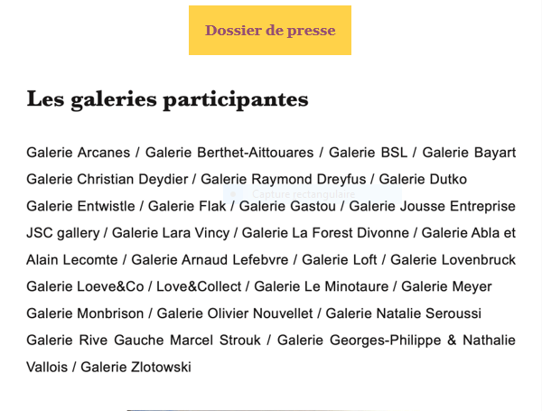 Toutes les galeries participantes avec leurs vitrines parées de belles pièces – une signalétique avec des ballons.