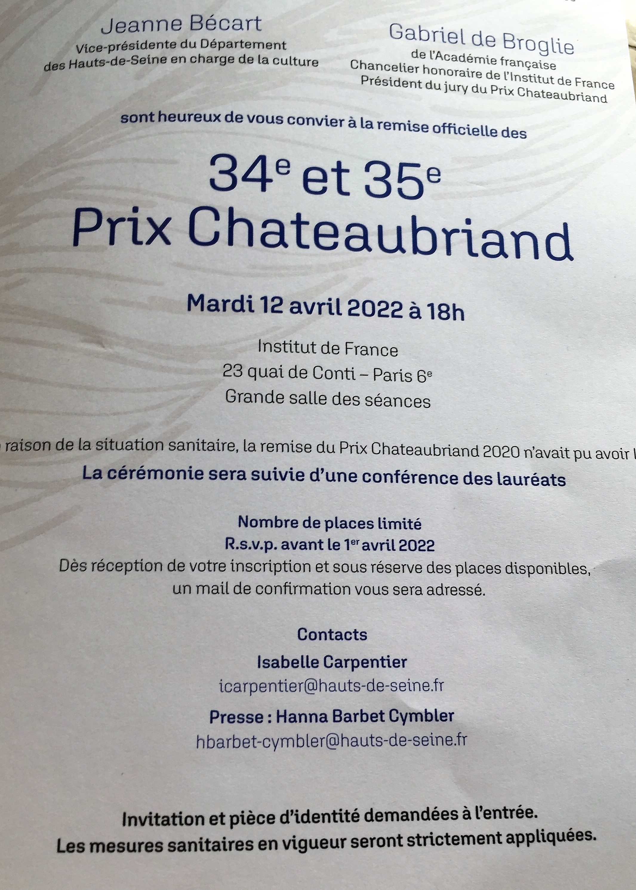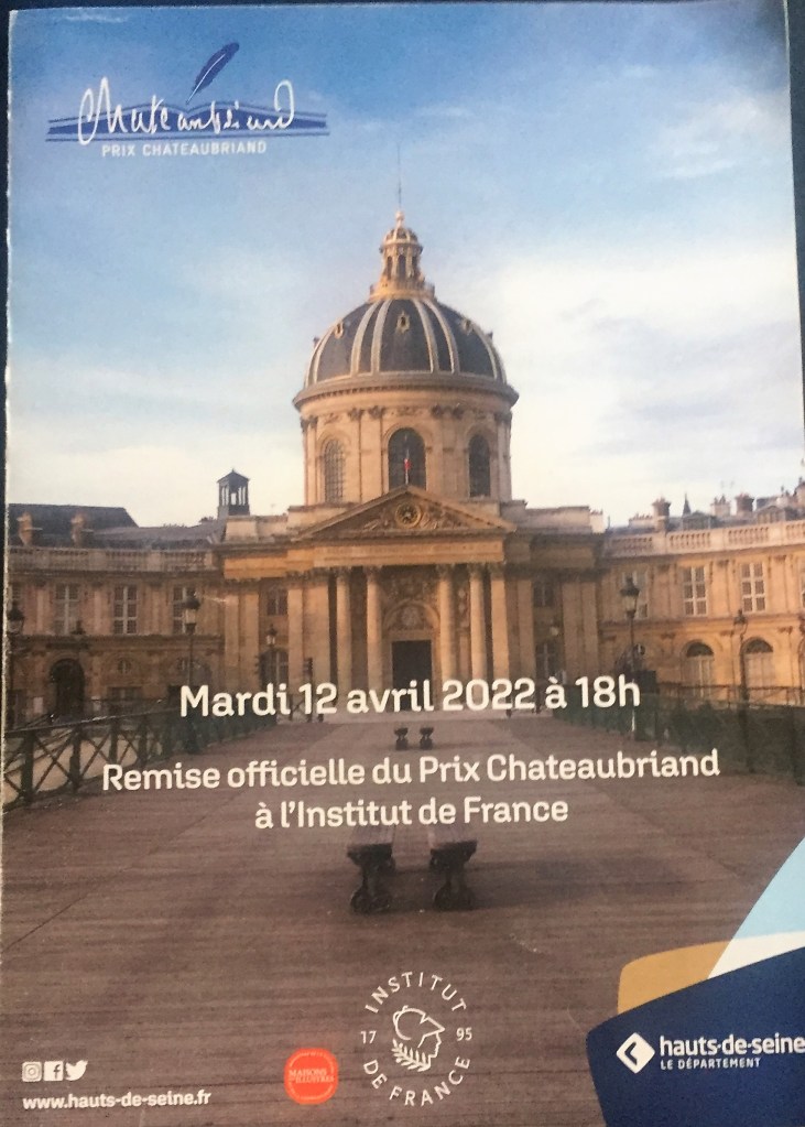 Prix Chateaubriand – remise officielle à l’Institut de France – le 12 Avril 2022.