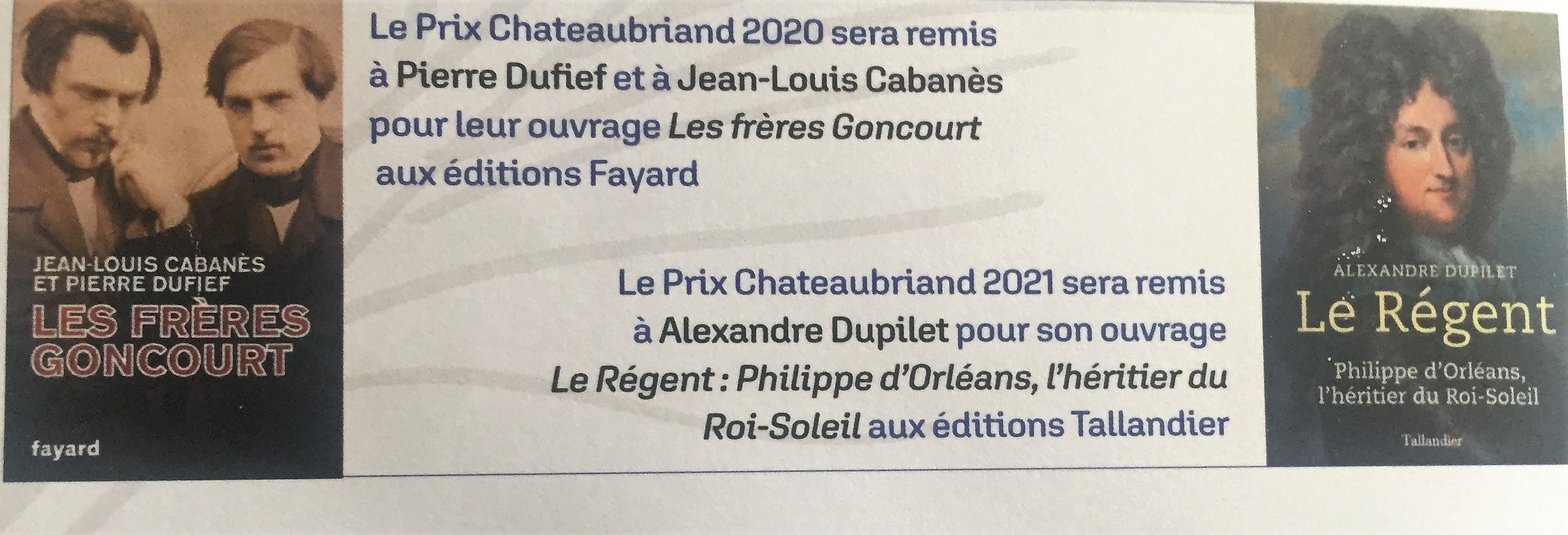 et le prix Chateaubriand 2021 à Alexandre Dupilet pour son ouvrage « Le Régent ;Philippe d’Orléans ,l’héritier du Roi-Soleil » (Tallandier)
