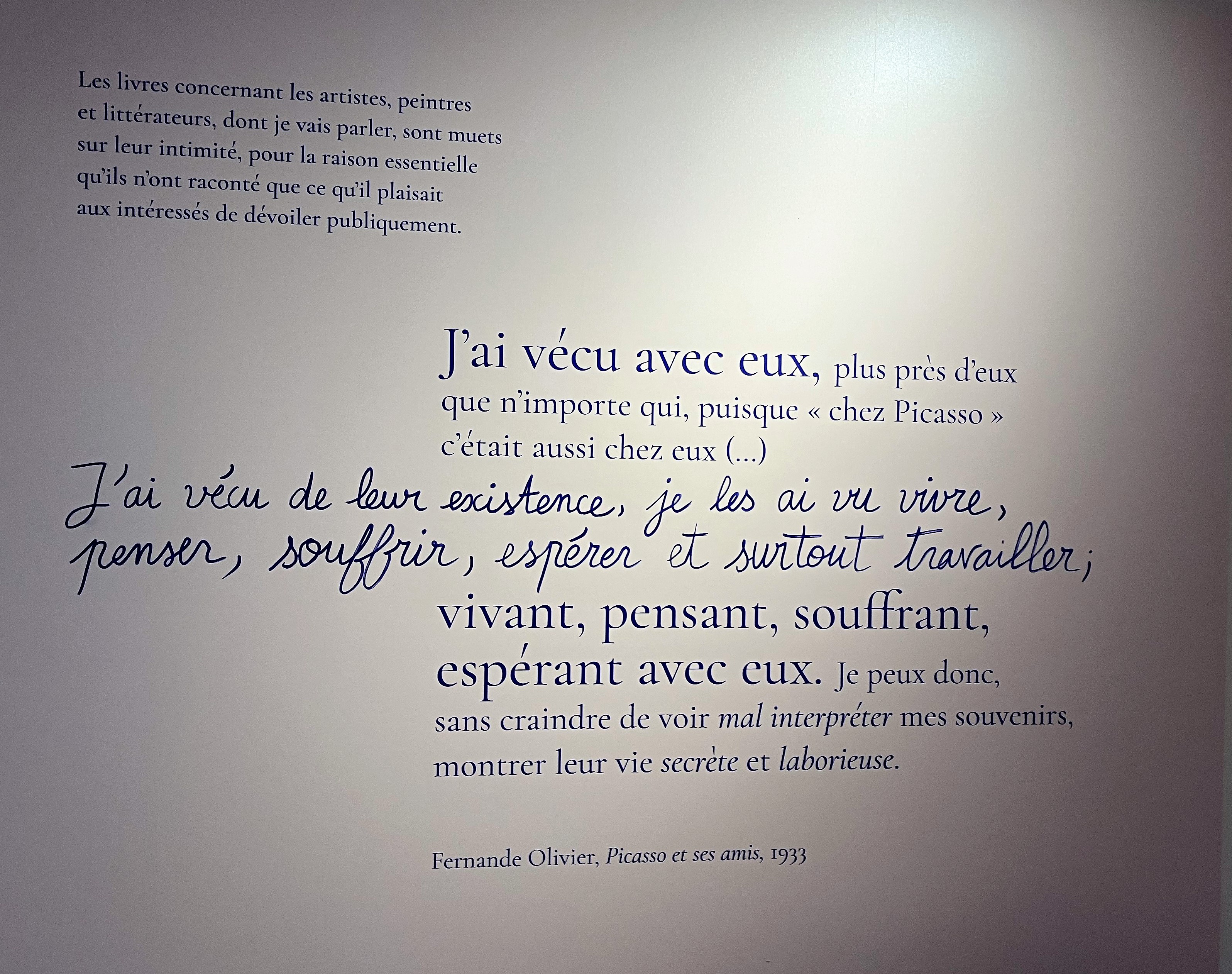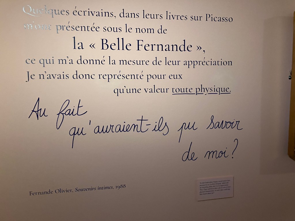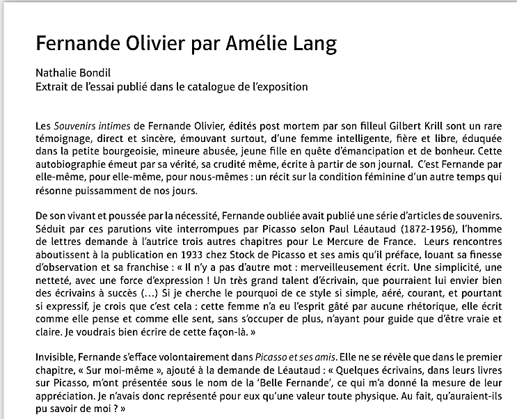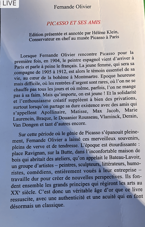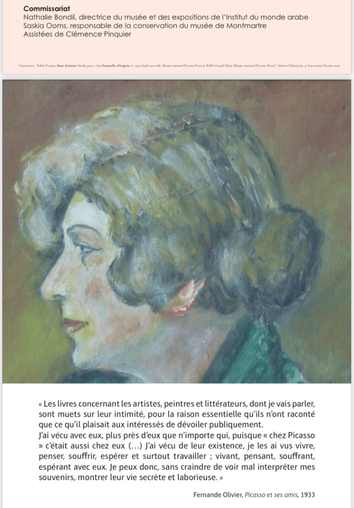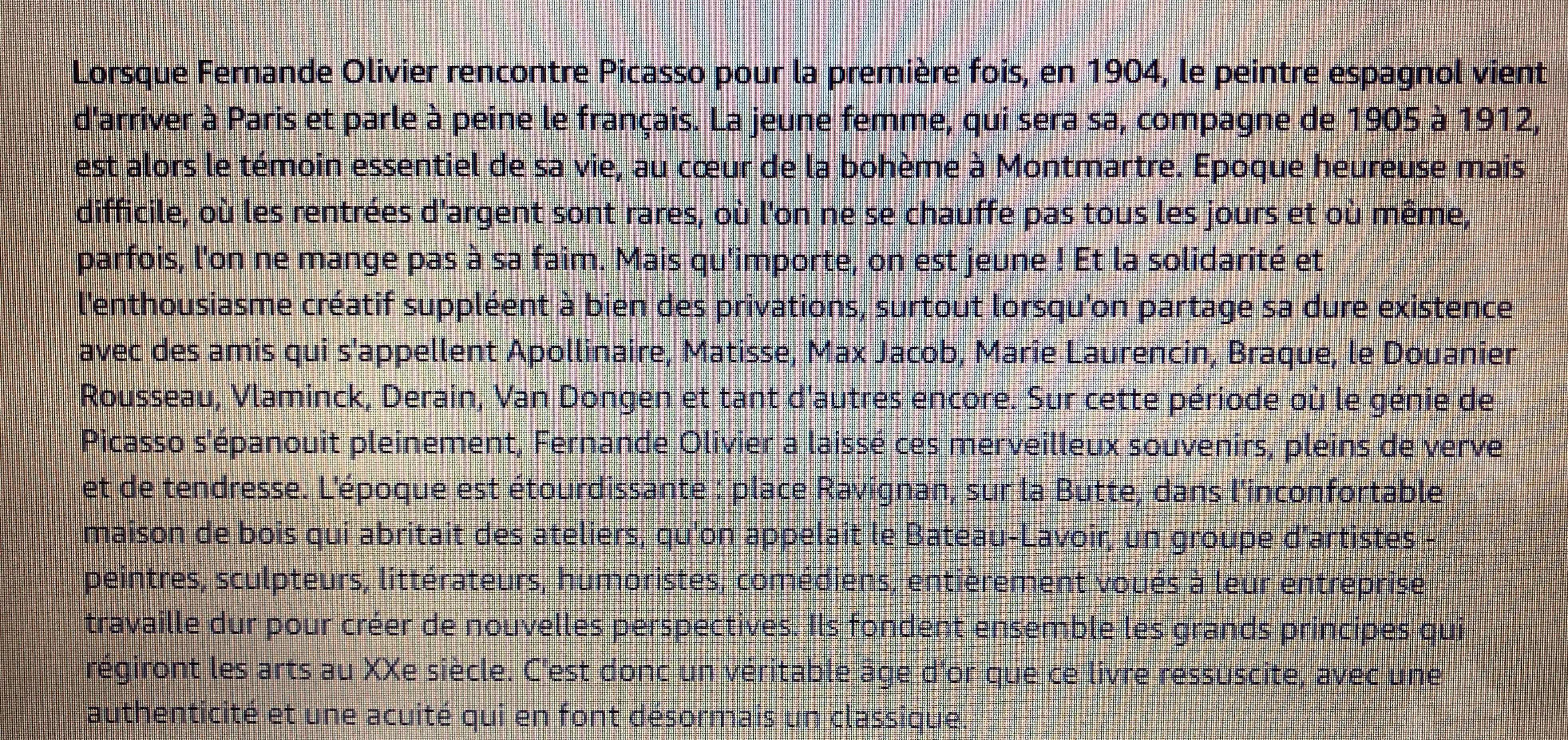 Cette superbe et riche exposition -avec ce livre déterminant dans l’élaboration de cette exposition ; l’univers du Bateau-Lavoir – la vie artistique des amis proches de Picasso-tout un univers décrit par Fernande Olivier.