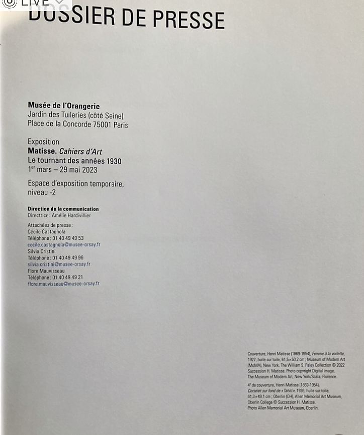 MATISSE Cahiers d’Art « Le tournant des années 1930 » Musée de l’Orangerie – depuis le 1er Mars 2023.
