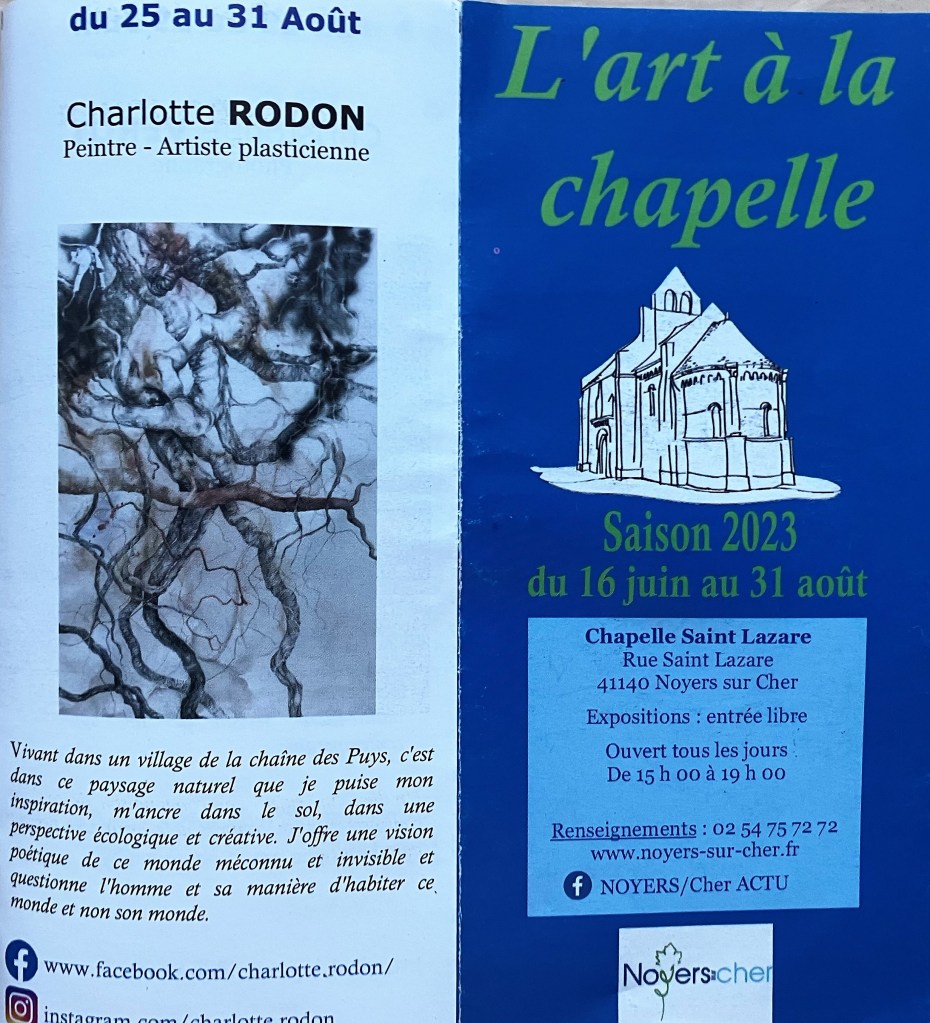 L’Art à la Chapelle -Saison 2023 -16 Juin au 31 Août 2023. Noyers sur cher. Le Vendredi 25 Août 2023. « » Charlotte Rodon « »