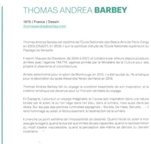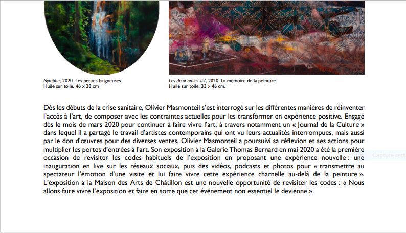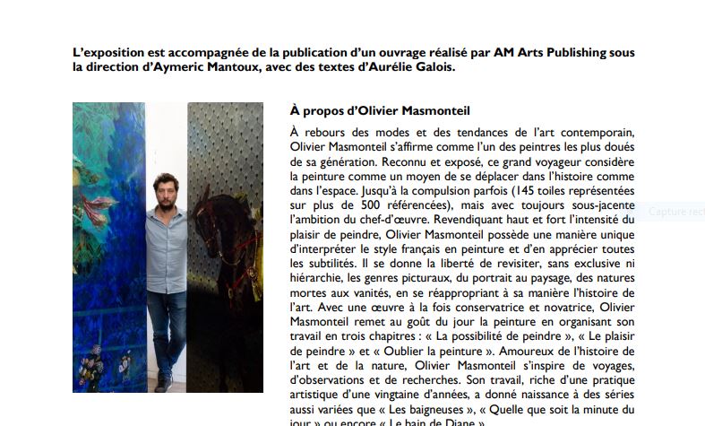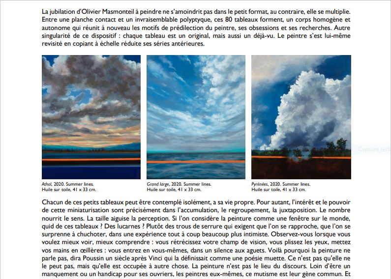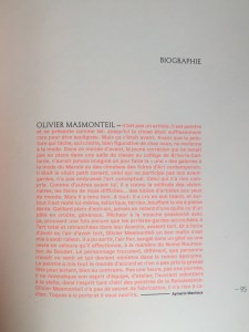 De plus un splendide catalogue enrichi d’un texte fort habile et riche d’émotions ( texte d’Aurélie Galois ) le chemin nous ouvre par ces mots l’univers pictural d’ Olivier Masmonteil –