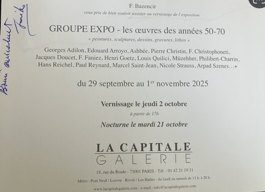Galerie La Capitale « Oeuvres des Années 5O-70 » à partir du 29 Septembre 2025.
