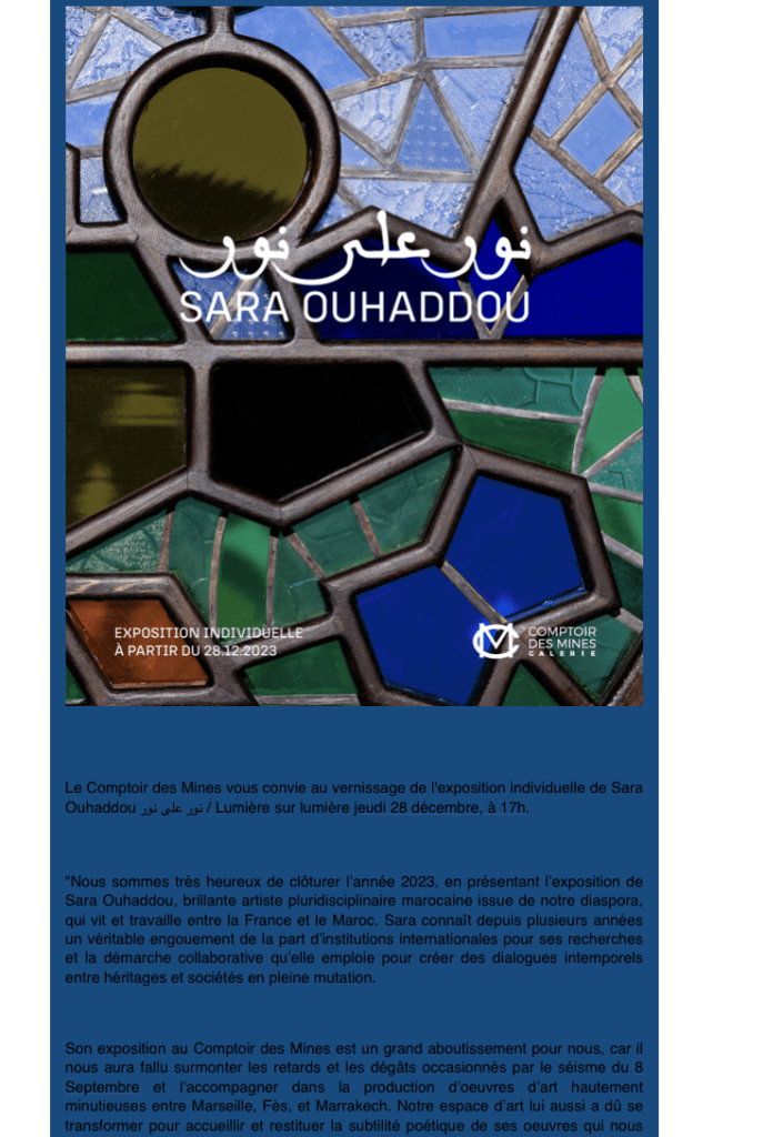 Comptoir des Mines ( galerie Marrakech ) » Lumière sur Lumière » exposition Sara Ouhaddou – à partir du 28 Décembre 2023.