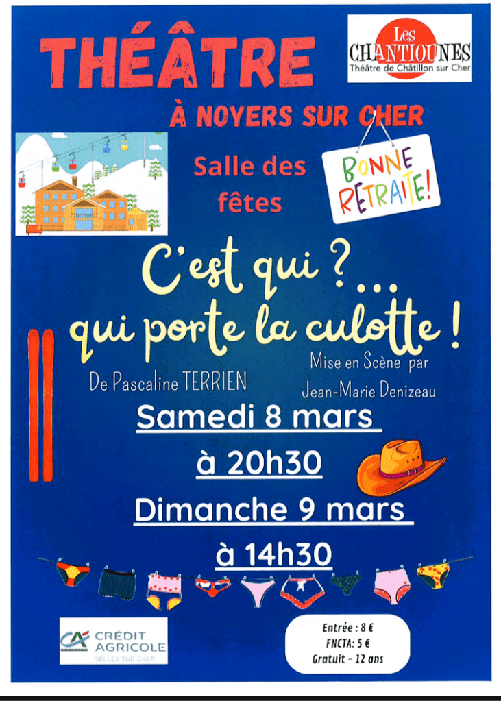 Comments: Commentaires fermés sur Théâtre » C’est qui ? qui porte la culotte ! à Noyers-sur-cher. le samedi 8 Mars et Dimanche 9 Mars 2025.