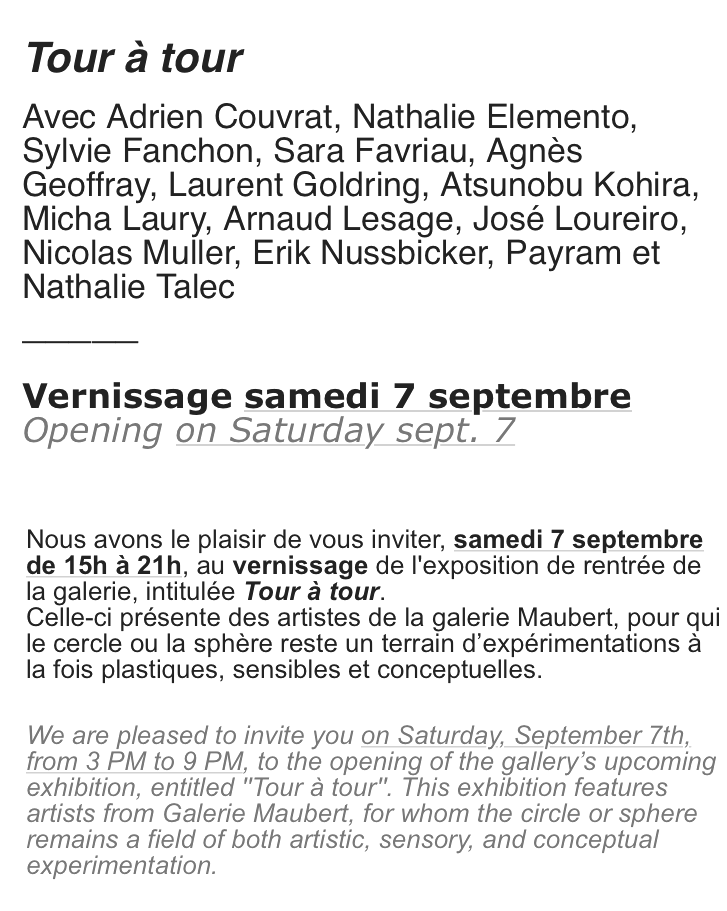 Comments: Commentaires fermés sur Galerie Maubert « Tour à tour » le 7 Septembre 2024.
