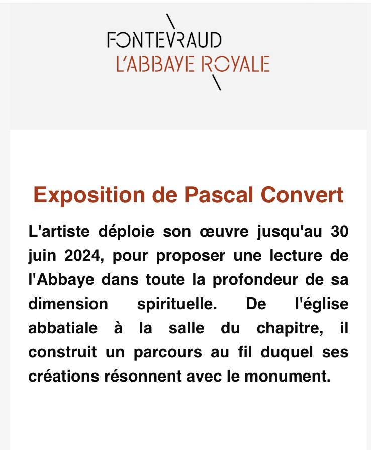 Comments: Commentaires fermés sur Abbaye Royale de Fontevraud – exposition Pascal Convert. à partir du 23 Mars 2024.